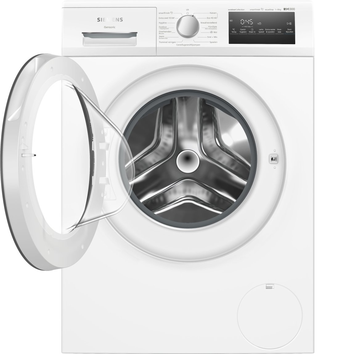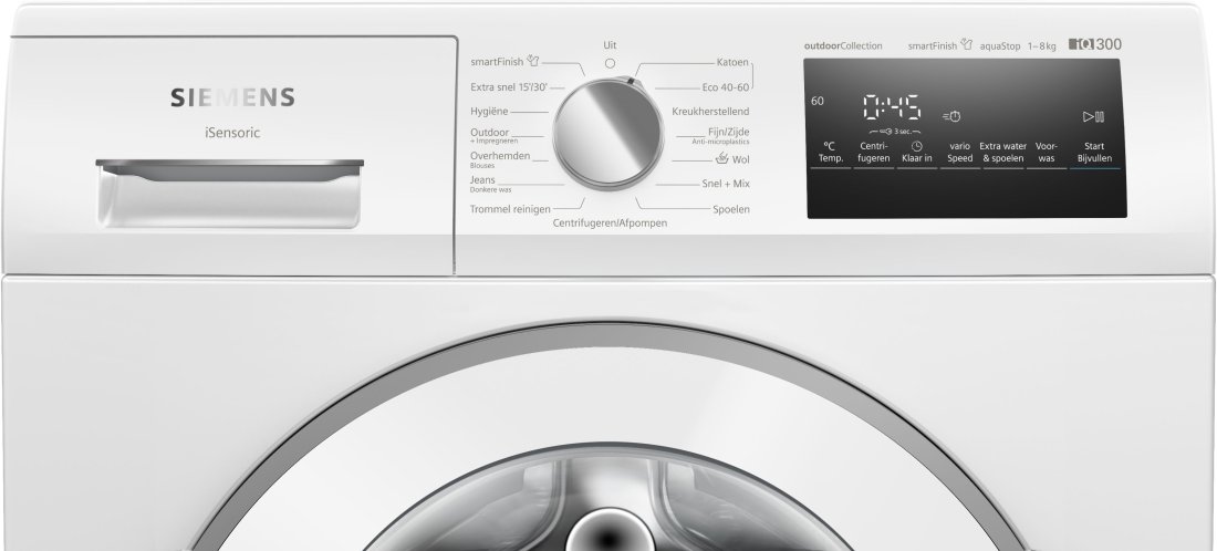 Standaard programma’s: Katoen, Kreukherstellend, Fijne was/Zijde, Wol handwas Speciale programma’s: Trommel reinigen (met herinneringsfunctie), Easy Ironing Steam Assistent, Overhemden / Blouses, Hygiëne, Jeans / Donkere was, Outdoor+Impregneren, Afpompen/Centrifugeren, Snel + Mix, Spoelen, Extra snel 30’/15’ varioSpeed: Tot 65% sneller wassen*** smartFinish: stoomprogramma om droge kledingstukken te ontkreuken TouchControl tiptoetsen: Voorwas, Klaar in, temperatuur, varioSpeed, start/bijvullen, Extra water, keuze voor centrifugeersnelheid/niet centrifugeren Bijvulfunctie: Pauzeer het draaiende wasprogramma, om vergeten wasgoed in de trommel bij te voegen. Groot display voor centrifugetoerental, resterende tijd, 24 u eindtijduitstel en beladingscapaciteit. Comfortabele elektronische metalen bedieningsknop voor het selecteren van alle was- en speciale programma’s Volume van trommel: 65 l 32 cm vulopening, grey, white met 160° te openen deur iQdrive motor voor extra stilte, zuinigheid en lange levensduur incl. 10jr garantie 10 jaar garantie op de koolborstelloze iQdrive motor antiVibration design: meer stabiliteit en stilte waterPerfect Plus: voor efficiënt gebruik van water, zelfs met kleine belading, dankzij intelligente sensortechnologie Verbruiksindicator: telt aantal gedraaide programma’s aquaStop waterbeveiliging: Siemens garantie bij waterschade - gedurende de gehele levensduur* Bodemplaat voor extra bescherming en geluidsisolatie Schuimherkenning: detecteert overdosering Onbalansherkenning Kinderbeveiliging op de deur Metalen deursluiting Comfort deurvergrendeling Signaal bij einde programma Doseringshulp voor vloeibaar wasmiddel Onderbouwbaar onder 85 cm nishoogte Afmetingen (h x b): 84.5 cm x 59.8 cm Diepte apparaat: 59.0 cm Diepte apparaat incl. deur: 63.2 cm Diepte apparaat met geopende deur: 104.9 cm * De diverse garantiemogelijkheden zijn te vinden op onze website.